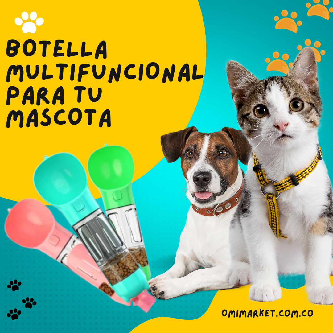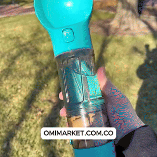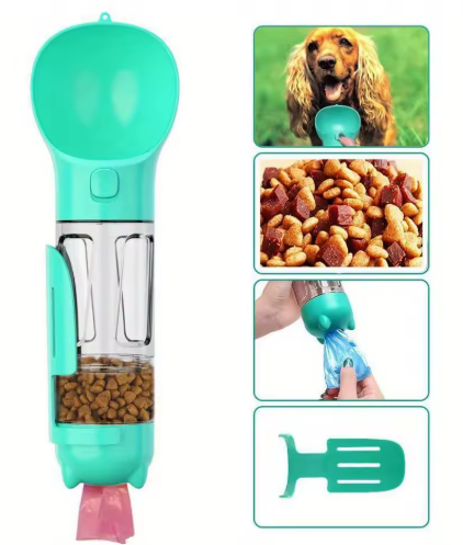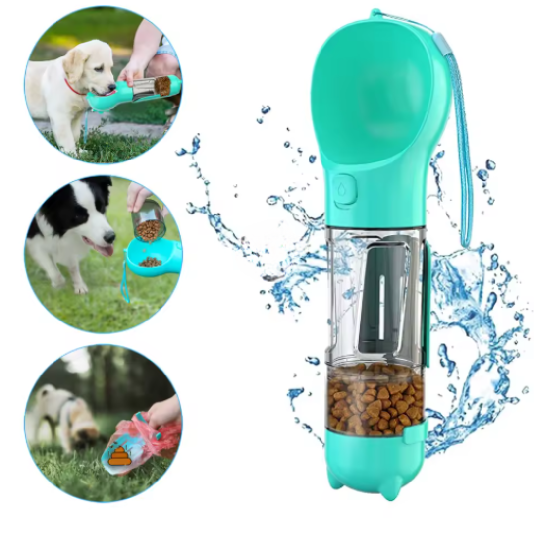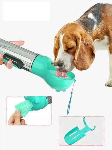 Imagina esto: sales al parque y en una sola botella llevas agua fresca, comida para tu mascota, bolsas para las heces y hasta una pala para recoger. ¡Todo en uno, como un combo perfecto! Sin mochilas pesadas ni manos ocupadas. Solo tomas esta botella multifuncional, la cuelgas en tu bolso con su cordón práctico y listo: tú y tu perro felices.